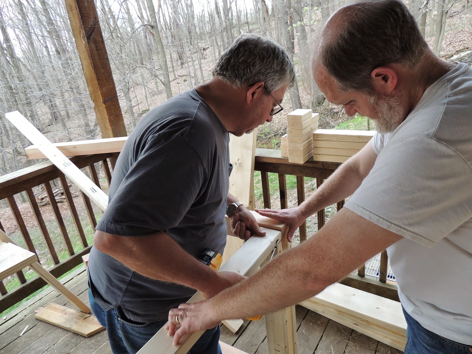 First is a picture of the homemade saw horses my dad put together to use and also the posts for the table legs leaning on one of them. We turned our lower deck into work space, which worked out very nicely and the weather cooperated almost entirely.